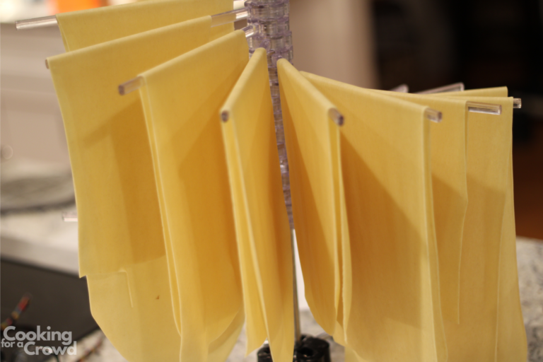 Use a drying rack to hold your pasta sheets until you are ready to cut them. I have a collapsable rack, so I can store it easily on top of my pasta machine. I also bought a couple plastic bins to store the machine. At some point I’ll film a video of making pasta.