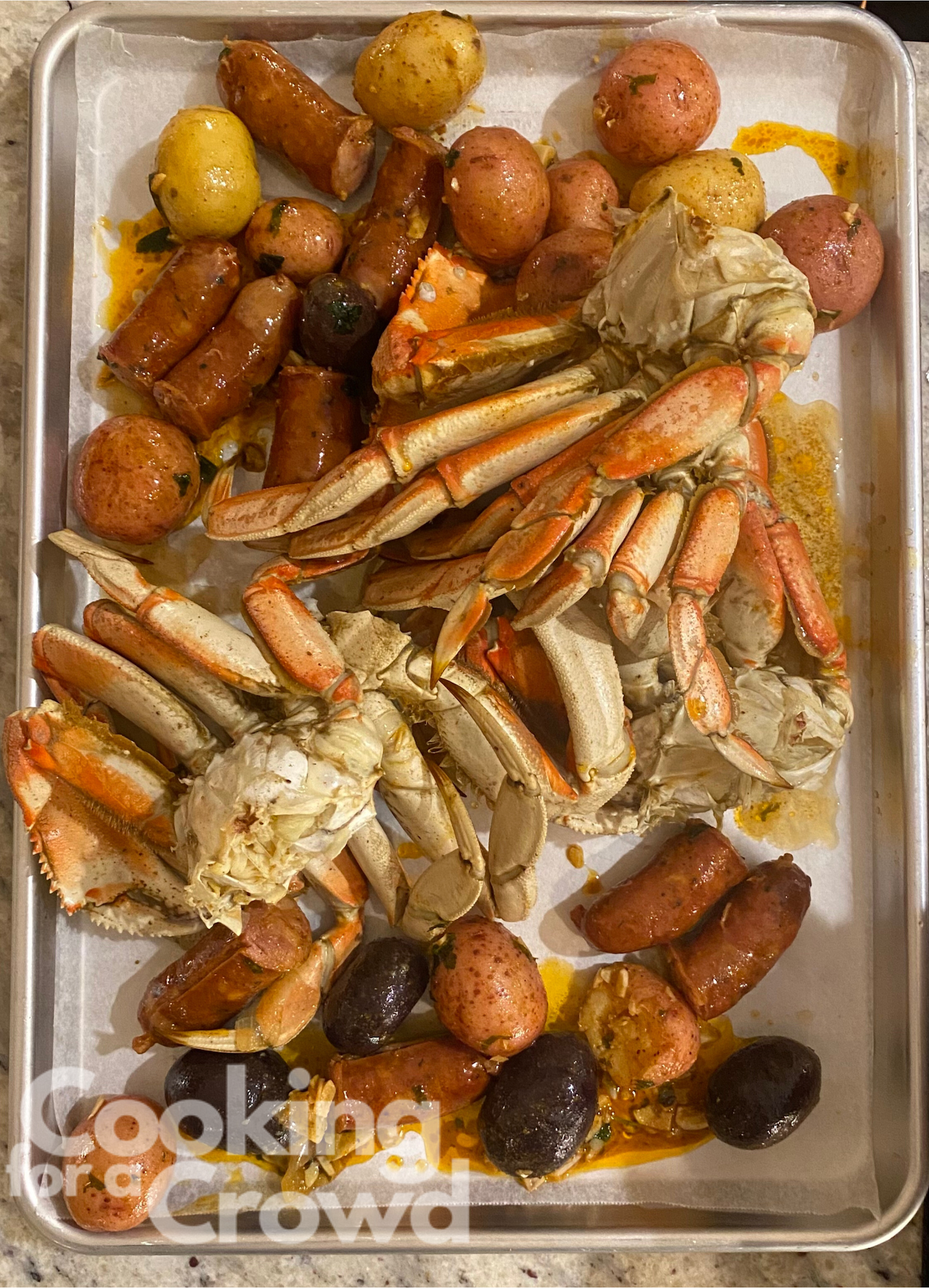 If you want to serve in a traditional boil style, place the crab, vegetables, and sausage on large trays and put them out on the table. Or, spread it all out on a plastic tablecloth. Or, put everything into individual serving bowls.