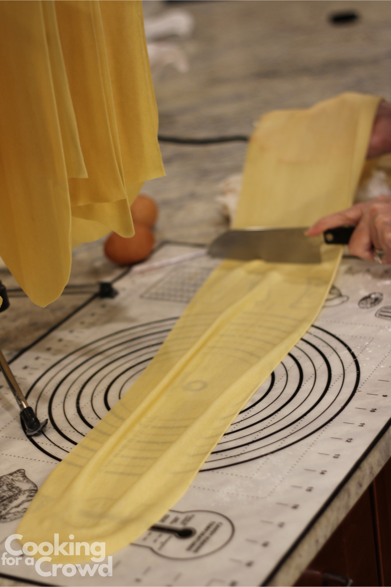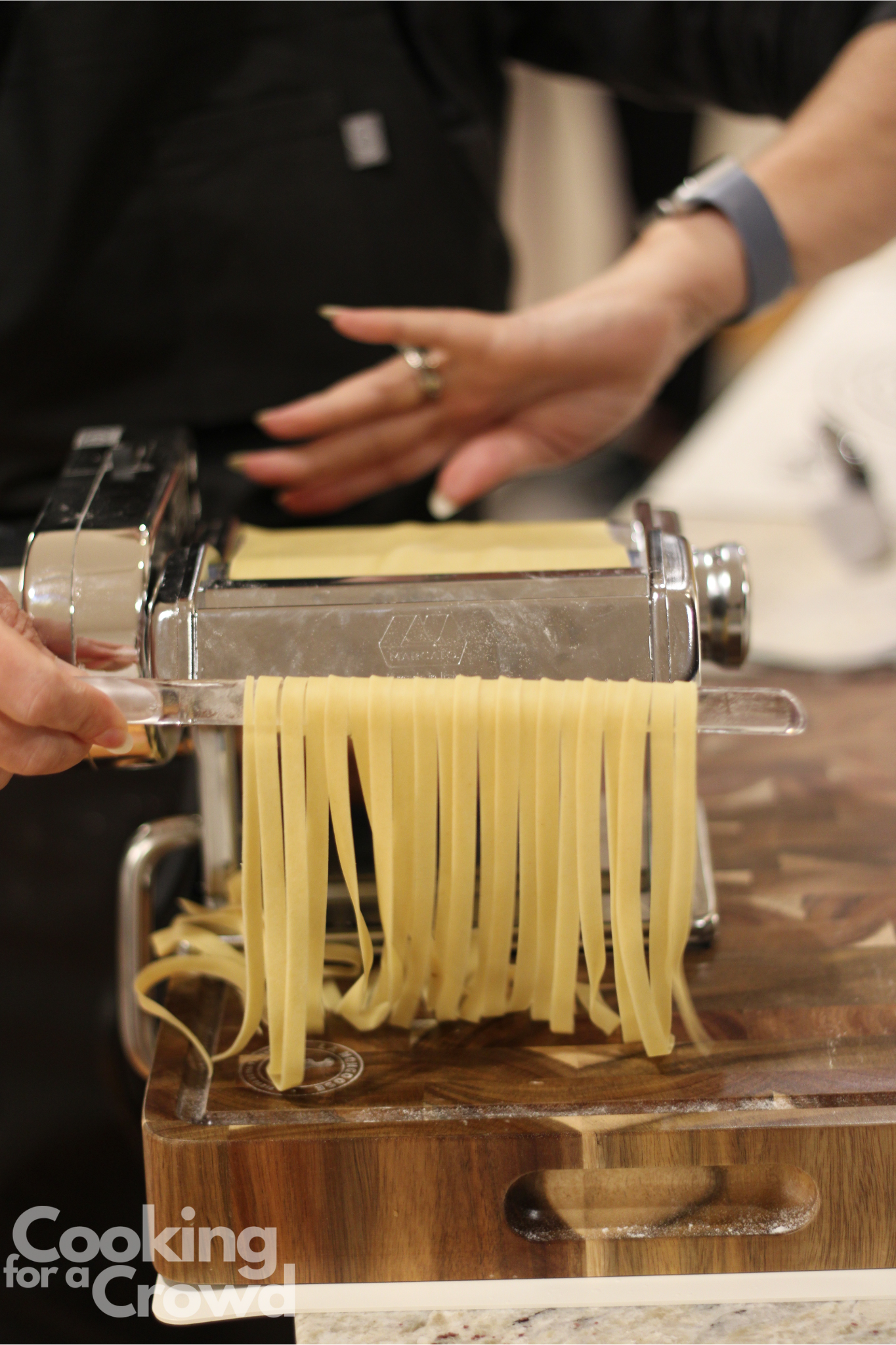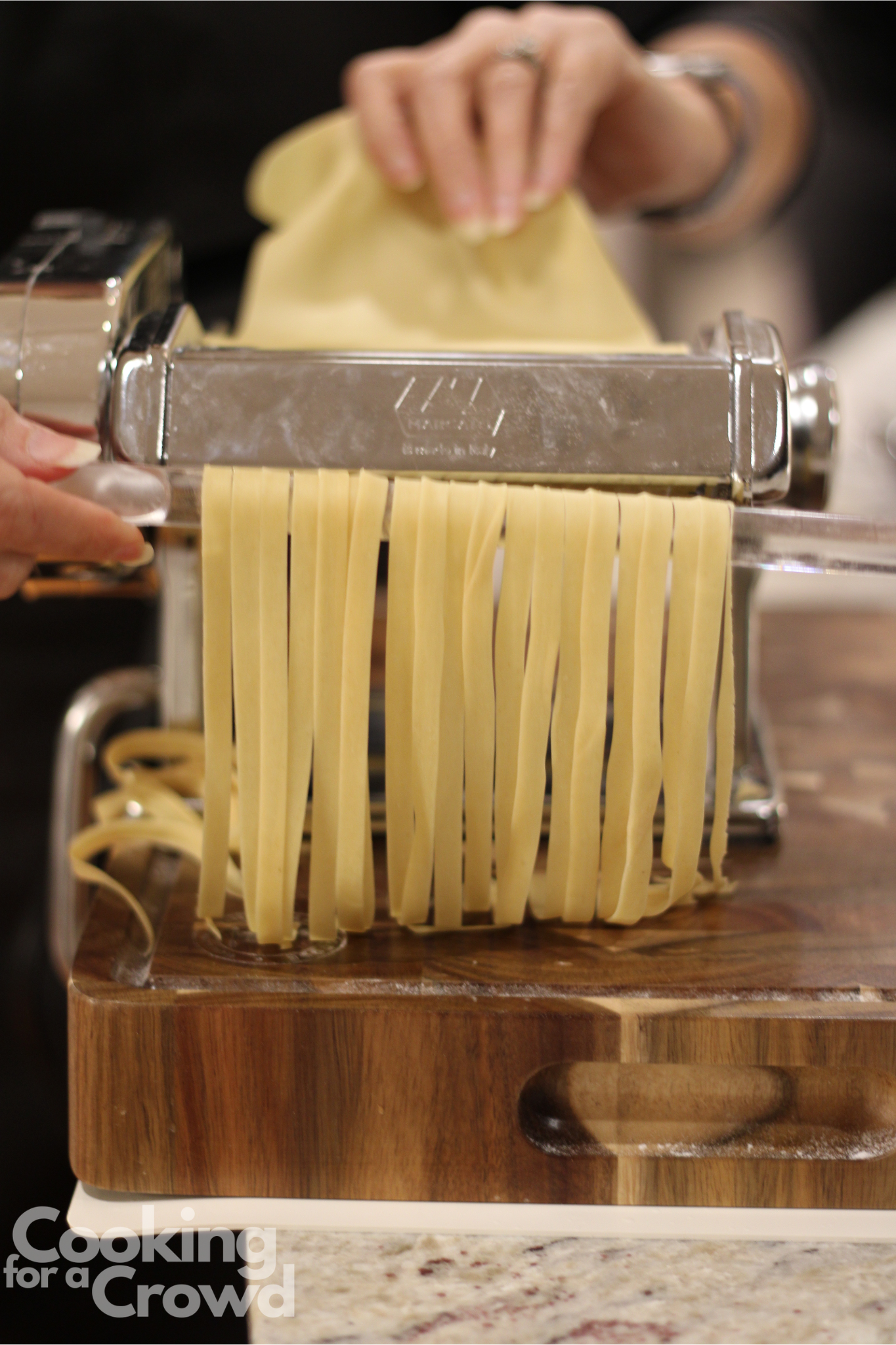 Use a pasta wand to catch the noodles as they are cut. The wand makes it easy to move the finished noodles to the drying rack.