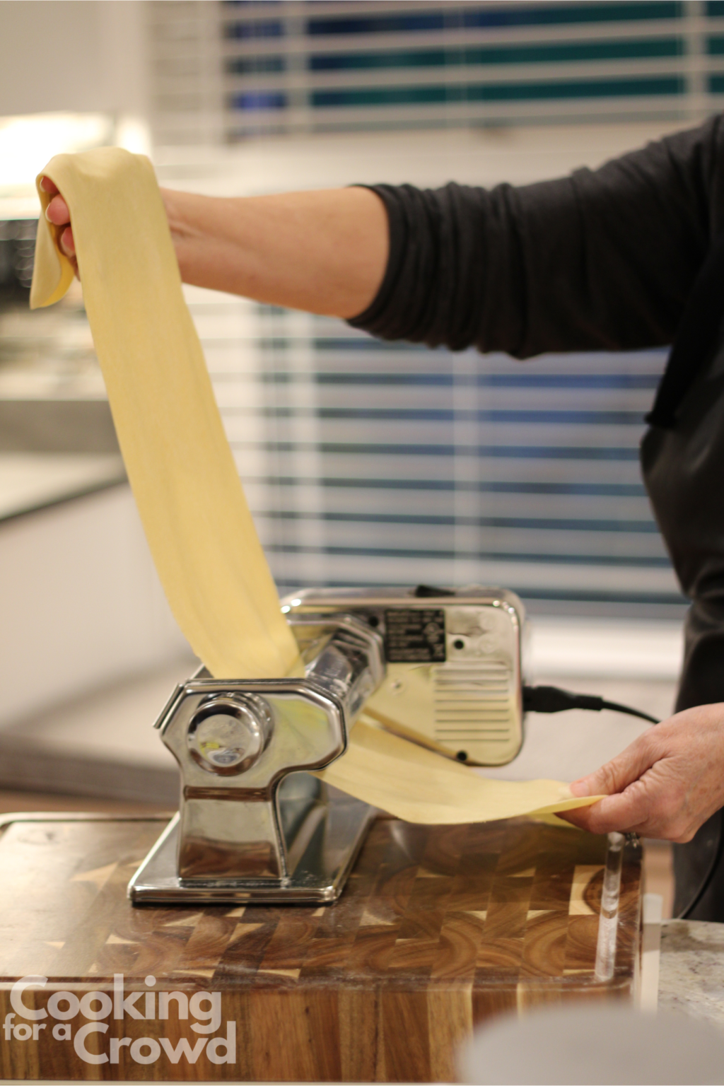 When ready to roll pasta, use a knife to cut off a slab, form it into a rectangle, and roll through pasta maker until desired thickness. My pasta maker starts at zero, and I roll to seven.