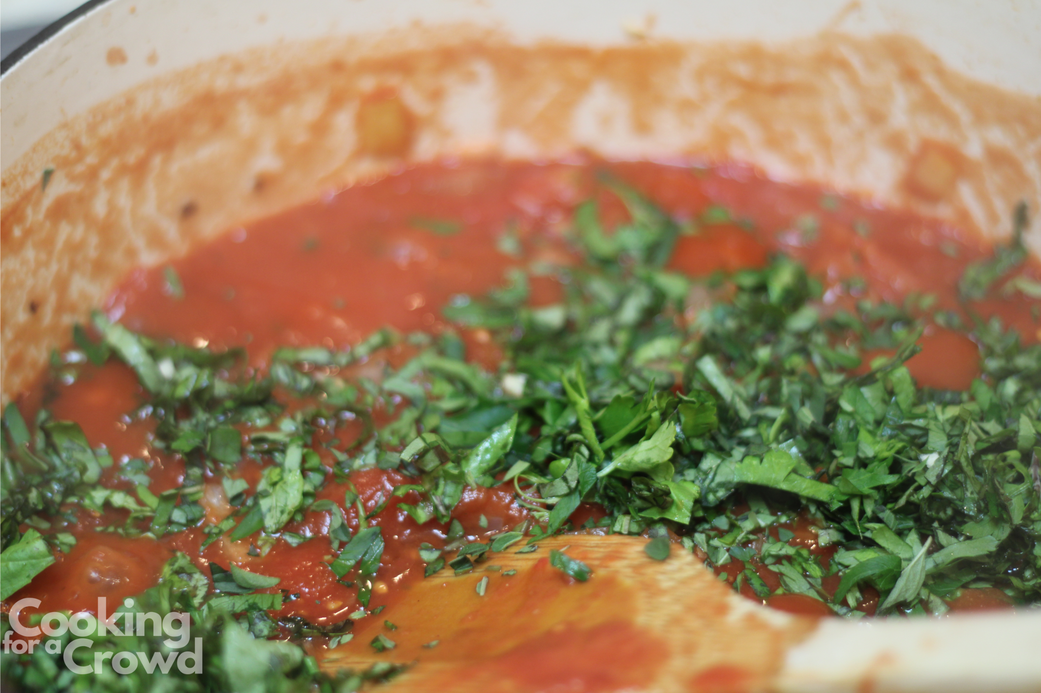 Open the tomato cans, and smash them with your fingers as you add them to the pot. Pour remaining sauce into pan.