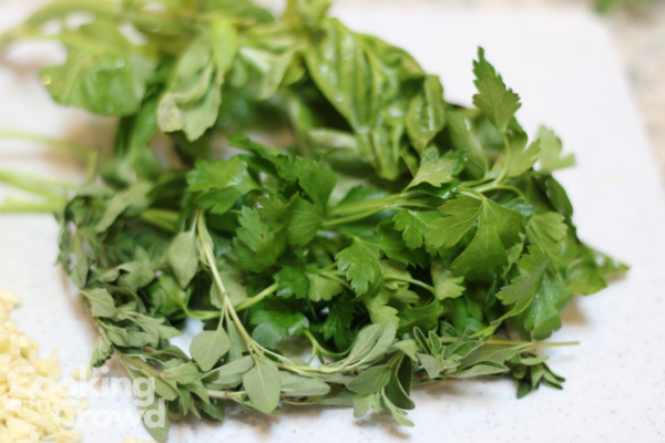 Start by chopping your onions and mincing the garlic. Then, prep your fresh herbs. I like to use fresh oregano, basil, and Italian flat leaf parsley. Dried herbs will work as a replacement if you do not have access to fresh. We have most of these in the garden!