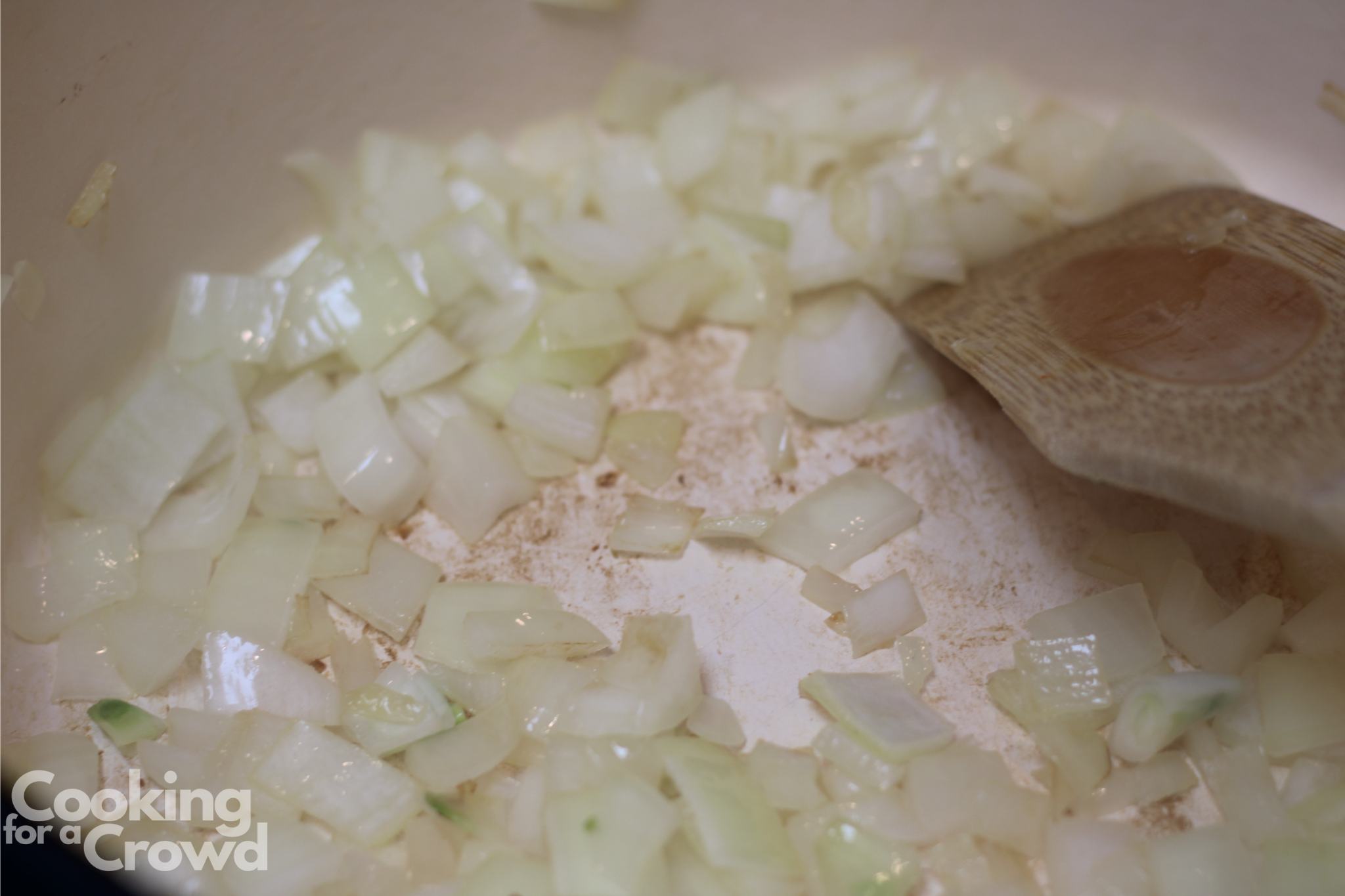 Once everything is prepped, sauté the onion until it is translucent. I use my big cast iron pot.