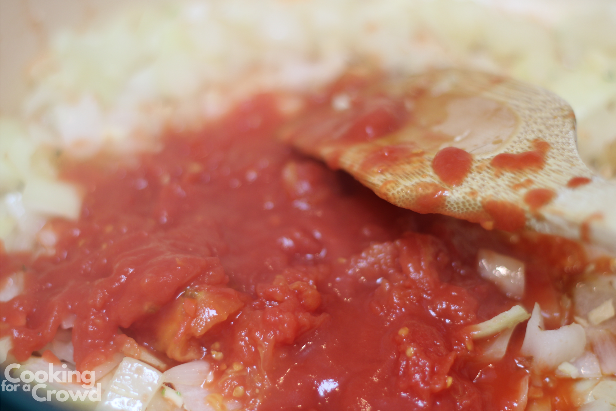 Then, add the tomatoes. I crush them with my hands, as I drop them into the pot.